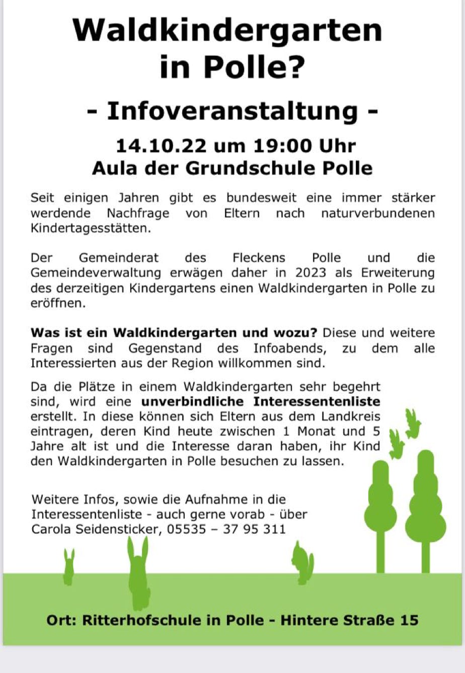 Da die Plätze sehr begehrt sind soll dieser Abend auch dazu dienen, eine unverbindliche Interessentenliste aufzustellen. In diese können sich Eltern aus dem Landkreis eintragen, deren Kind heute zwischen 1 Monat und 5 Jahre alt ist und die Interesse daran haben, ihr Kind den Waldkindergarten in Polle besuchen zu lassen.