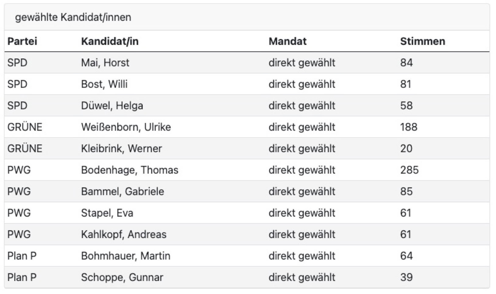 Die anderen PWG-KandidatInnen haben folgende Stimmen bekommen: